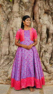 Step into regal elegance with this stunning Pink & Purple Banarasi Silk Long Gown for women.Perfect for traditional events, casual gatherings, or festive celebrations, this handcrafted piece is a must-have addition to your wardrobe.