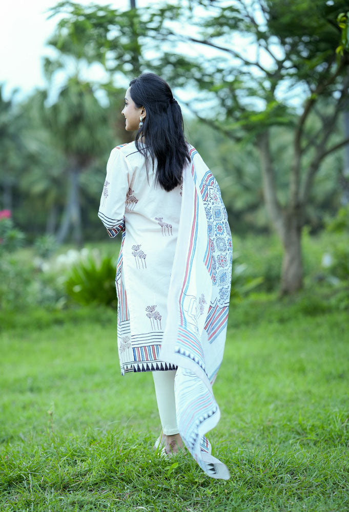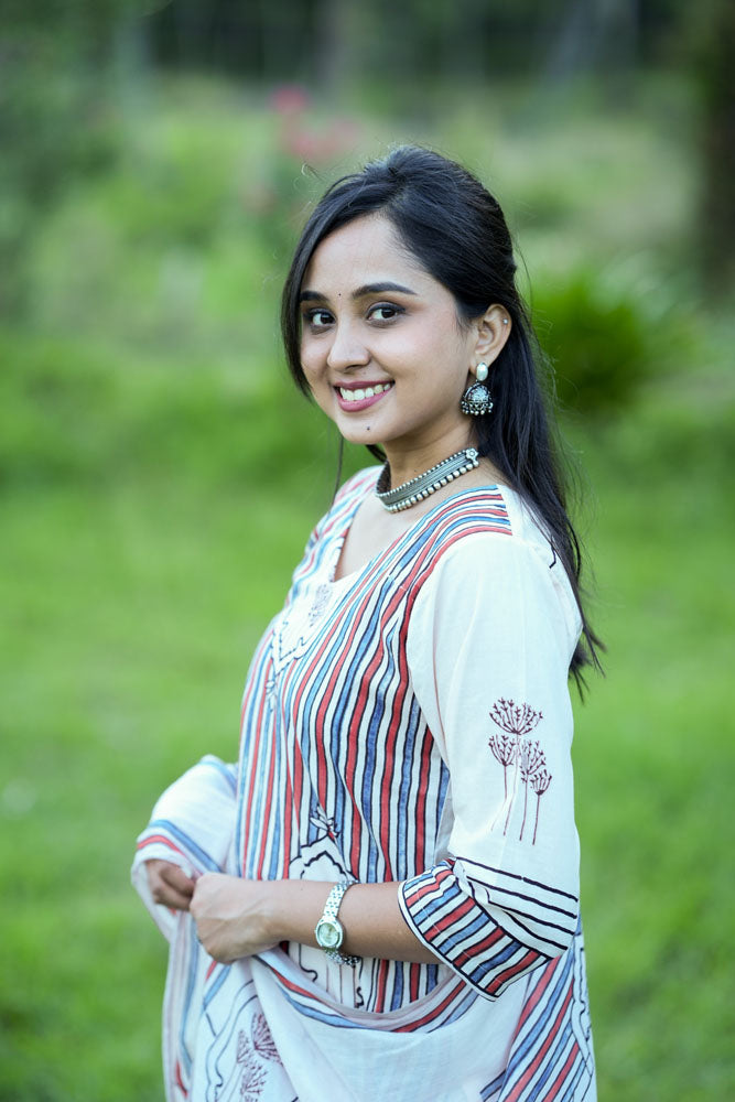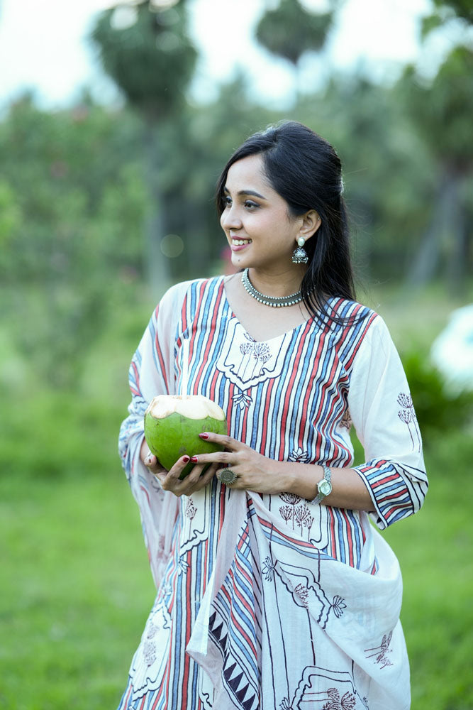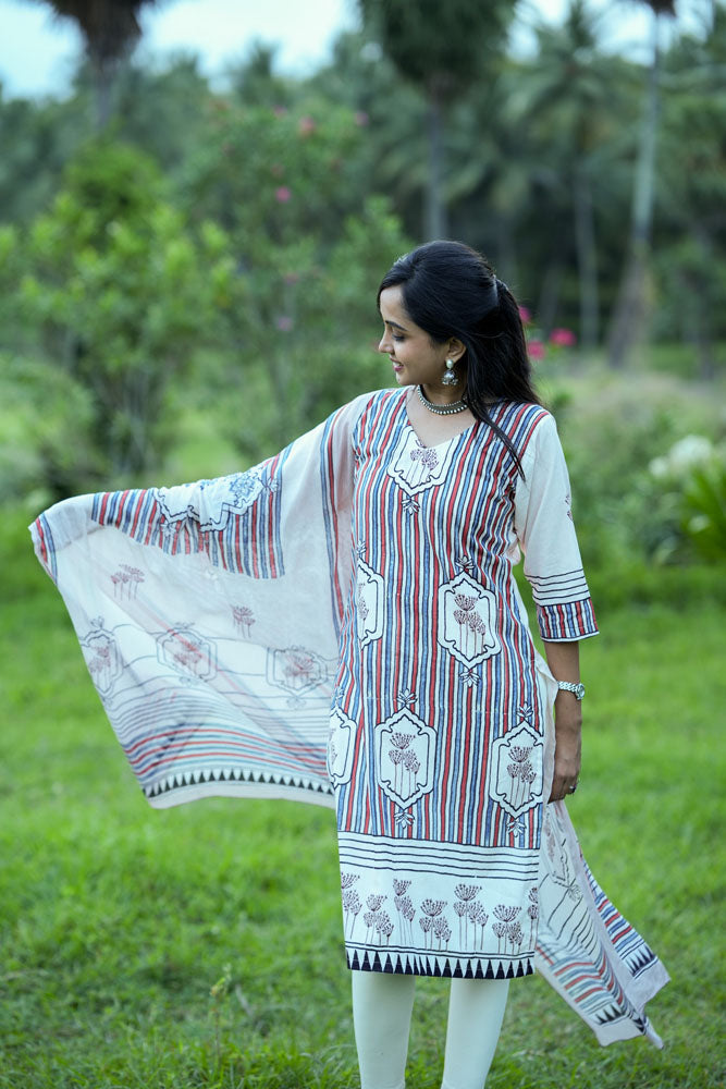 Step into everyday elegance with our Ivory Stripes – Ivory White Printed Kurti Set with Dupatta, a breezy blend of comfort and charm. Crafted on a soft ivory white base, this kurti features a refined mix of vertical red, blue, and beige stripes, beautifully complemented by floral block prints for a subtle ethnic edge.