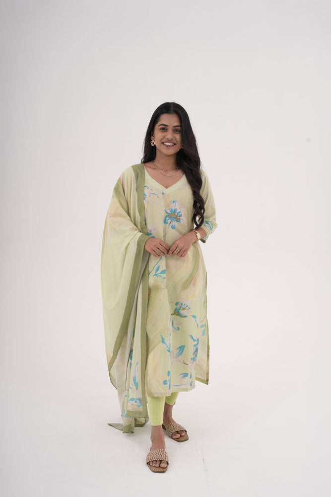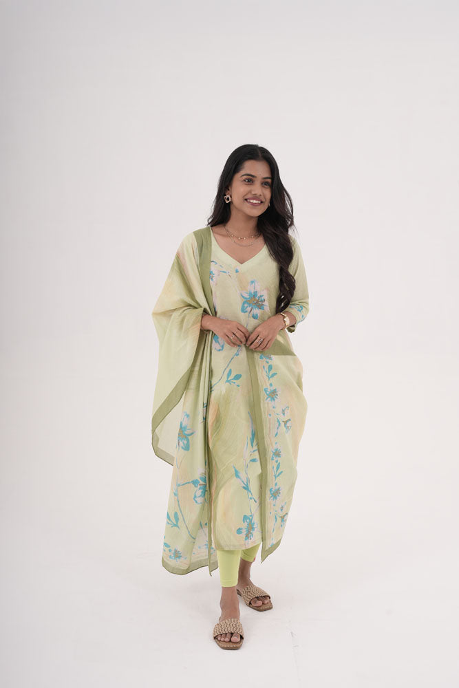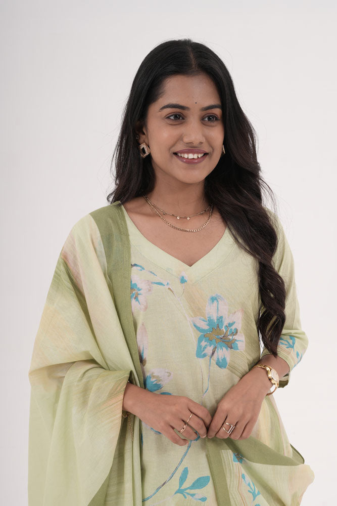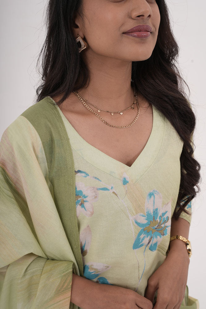 Add a breath of fresh elegance to your wardrobe with our Mint Bloom – Light Green Floral Kurti Set. Tailored in breezy, soft cotton fabric, this kurti features a soothing light green base with delicate blue floral prints, offering a graceful and refreshing look. The V-neckline and 3/4th sleeves ensure both comfort and charm, making it a wardrobe essential for relaxed ethnic wear.