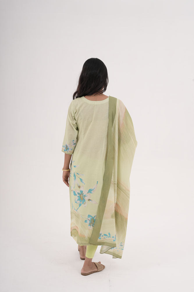 The look is completed with a coordinated dupatta, adorned with matching floral accents and a subtle peach-toned border, adding just the right pop of contrast. Whether you're stepping out for errands or dressing up for a get-together, this kurti set blends ease and elegance effortlessly.