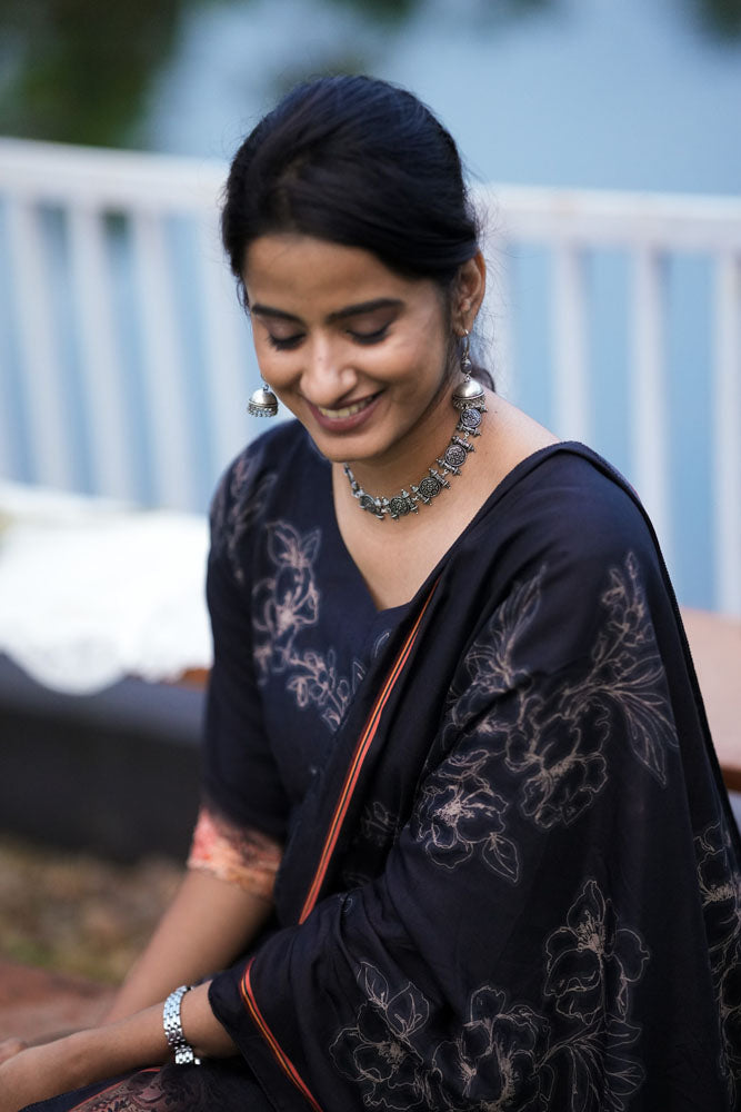 Navy Blue Floral Kurti Set with Dupatta, a refined fusion of subtlety and sophistication. The deep navy kurti is adorned with muted beige floral motifs, offering a soft, classic aesthetic. The elbow-length sleeves and rounded neckline give a neat, flattering silhouette that’s both modest and stylish.