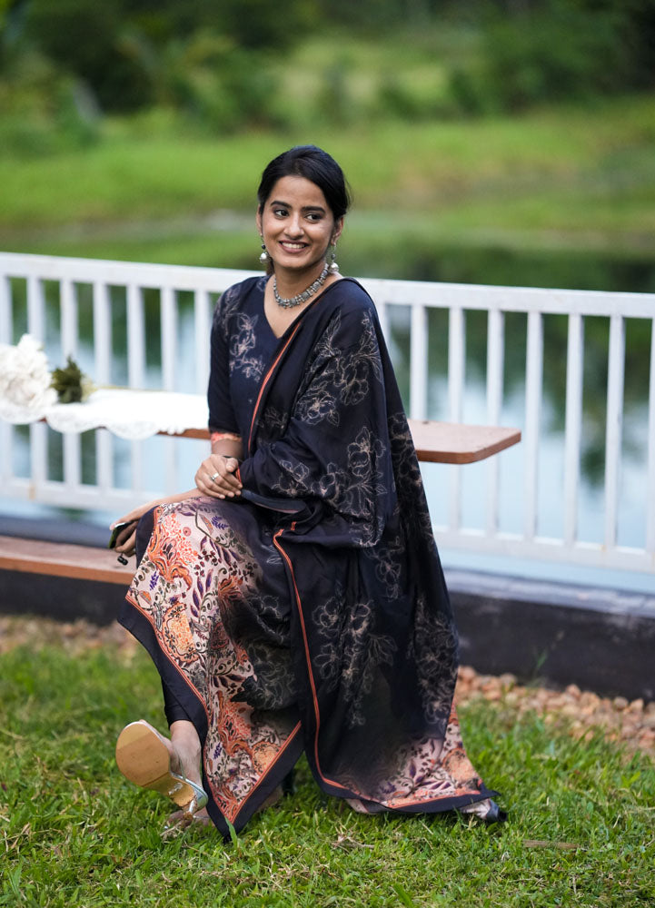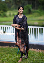 What truly elevates the look is the contrast printed dupatta, bordered in burnt orange and copper florals with intricate ethnic detailing that brings warmth and richness to the ensemble. Paired with solid navy churidar leggings, this set strikes the perfect balance between comfort and grace.