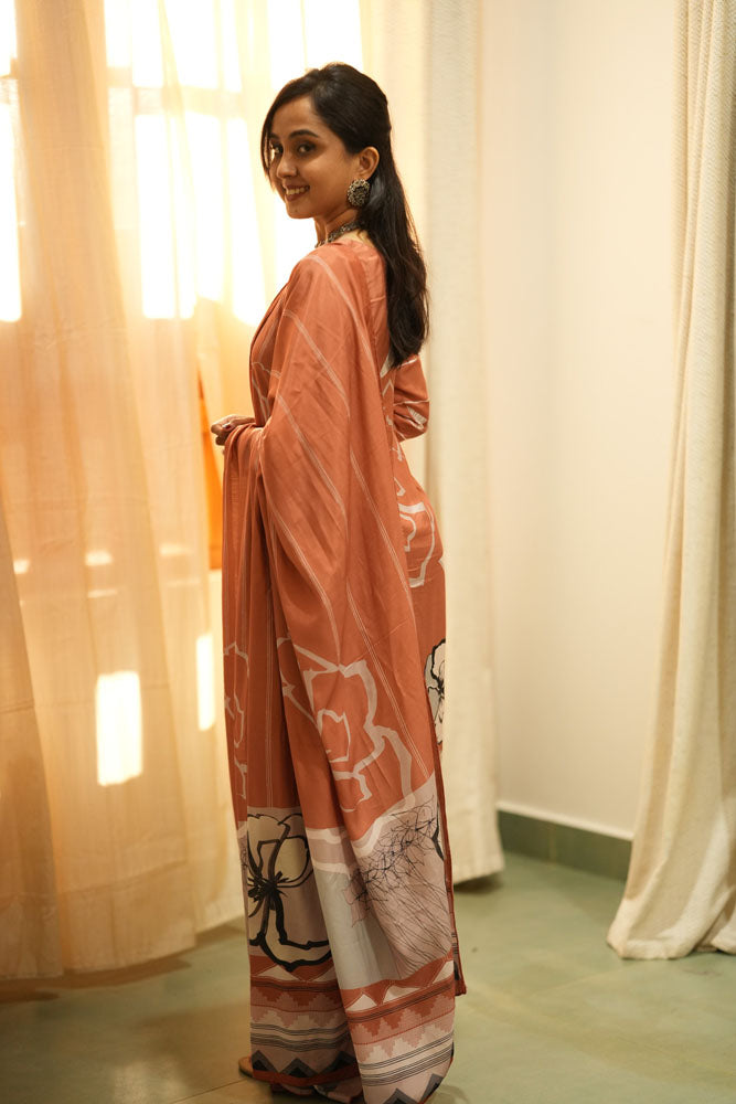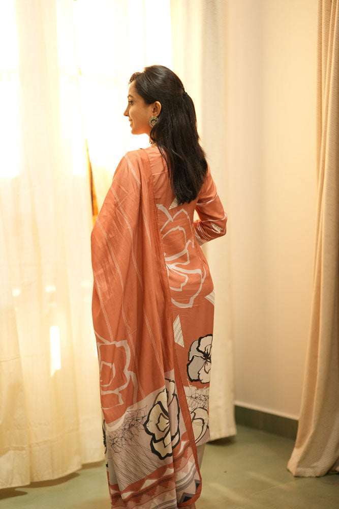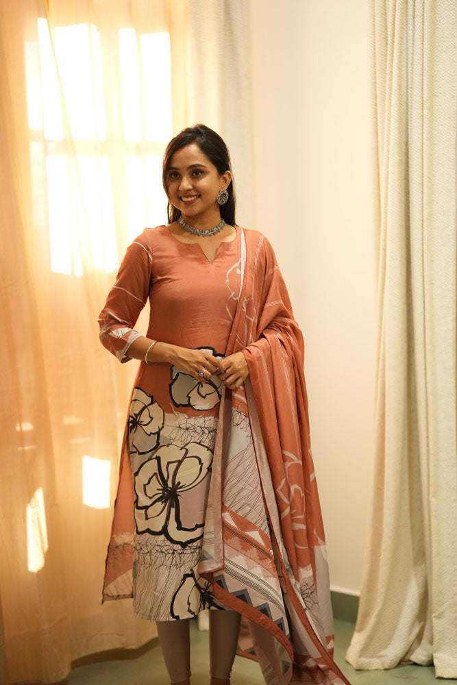 Elevate your ethnic wardrobe with our Terracotta Blossom – Rust Peach Floral Kurti Set with Dupatta, a perfect harmony of warmth and grace. Crafted in a rich rust peach hue, this kurti features a stylized floral block print that blooms boldly across the lower half of the A-line silhouette, complemented by a flowy matching dupatta adorned with coordinated prints.