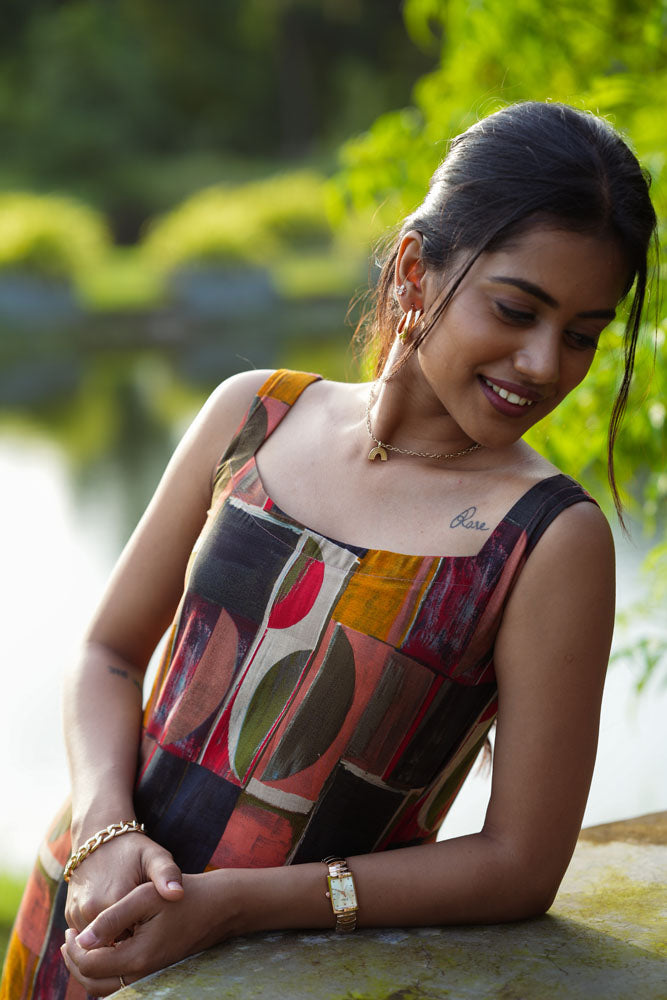 Introduce a modern edge to your wardrobe with this striking earth-toned coord set for women, designed to blend bold prints with everyday comfort. The sleeveless, straight-fit kurti features artistic block-style abstract prints in tones of black, olive green, mustard, rust, and red, bringing a vibrant and expressive flair to the look.