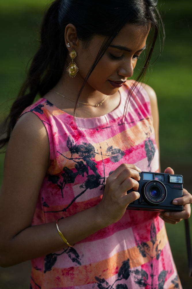The design features a striking mix of horizontal brushstroke-style stripes in pink, orange, and peach, layered under a bold black floral print overlay, giving it a perfect balance of playful charm and artistic flair.
