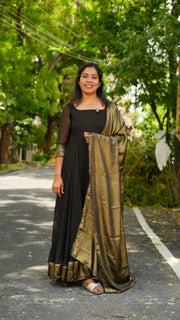 Make a bold style statement with this stunning black Anarkali kurti paired with a rich golden dupatta. Designed with a flattering flared silhouette and elegant sheer sleeves, this ethnic outfit blends traditional charm with modern sophistication. The shimmering golden dupatta adds a festive touch, making it perfect for weddings, parties, receptions, and cultural celebrations. A must-have for women who love timeless black outfits with a luxurious appeal.