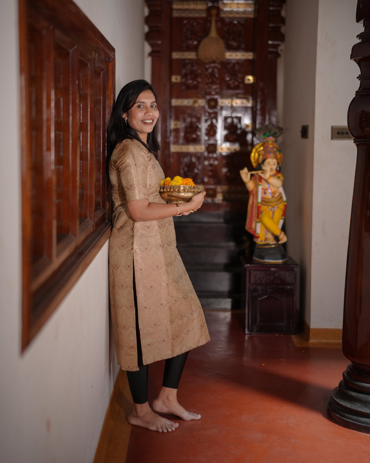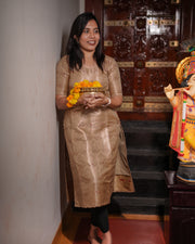 Enhance your festive wardrobe with this elegant beige gold printed straight kurti. A perfect blend of tradition, comfort, and timeless style.