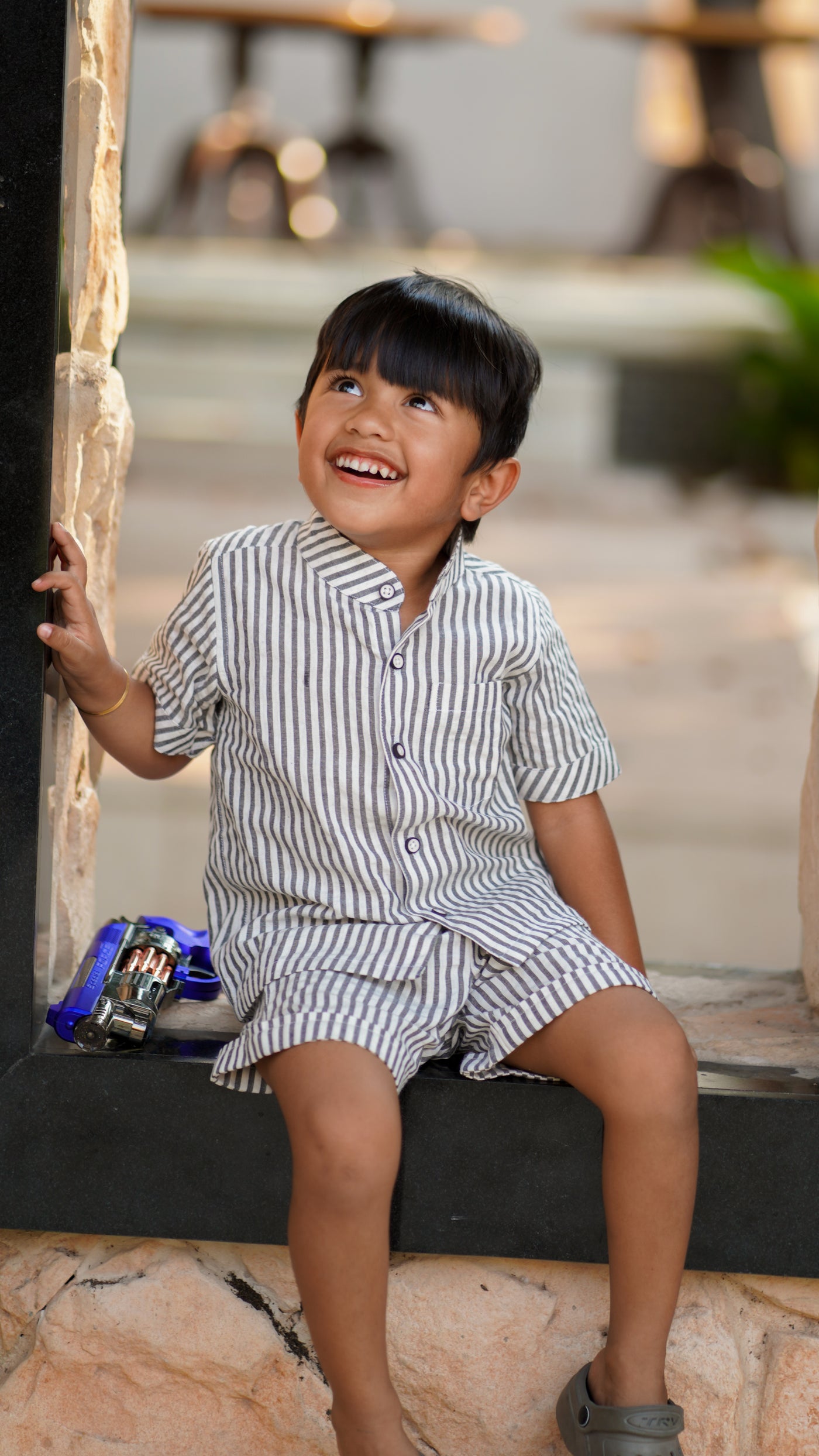 This adorable striped co-ord set is perfect for your little one's playful adventures! Featuring a half-sleeve shirt with a classic collar and matching comfy shorts, it ensures all-day comfort and style