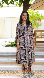 Upgrade your wardrobe with this stylish geometric print kurta set for women. Made from soft, breathable cotton fabric, this outfit is perfect for office wear, casual outings, and festive occasions. The modern print and flattering fit add a touch of elegance and comfort to your everyday look. Available in all sizes.