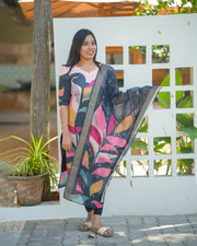 Black Multicolor Leaf Printed Kurti with Dupatta