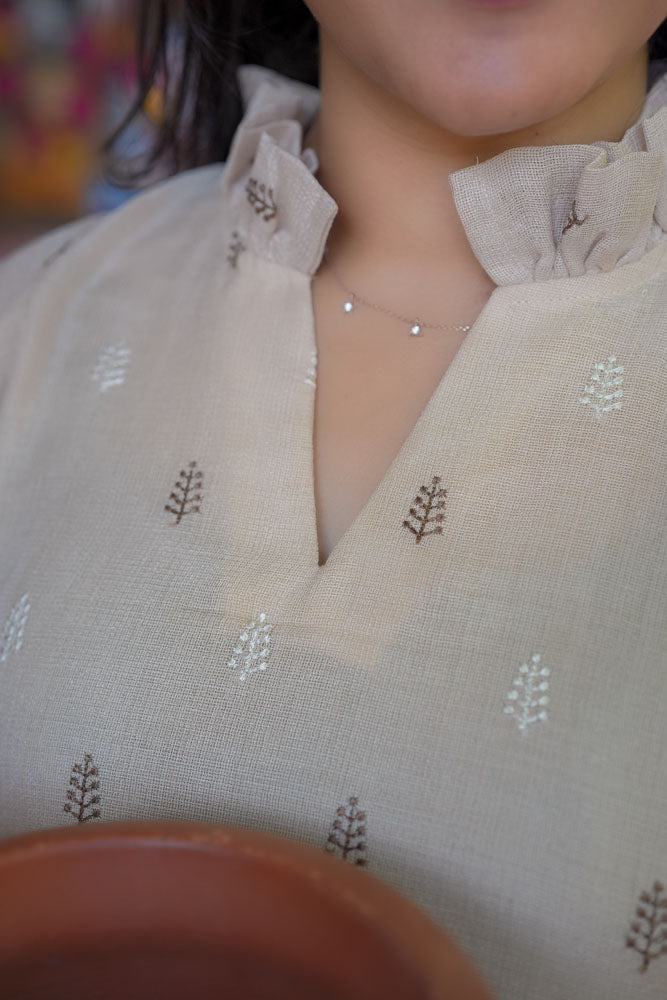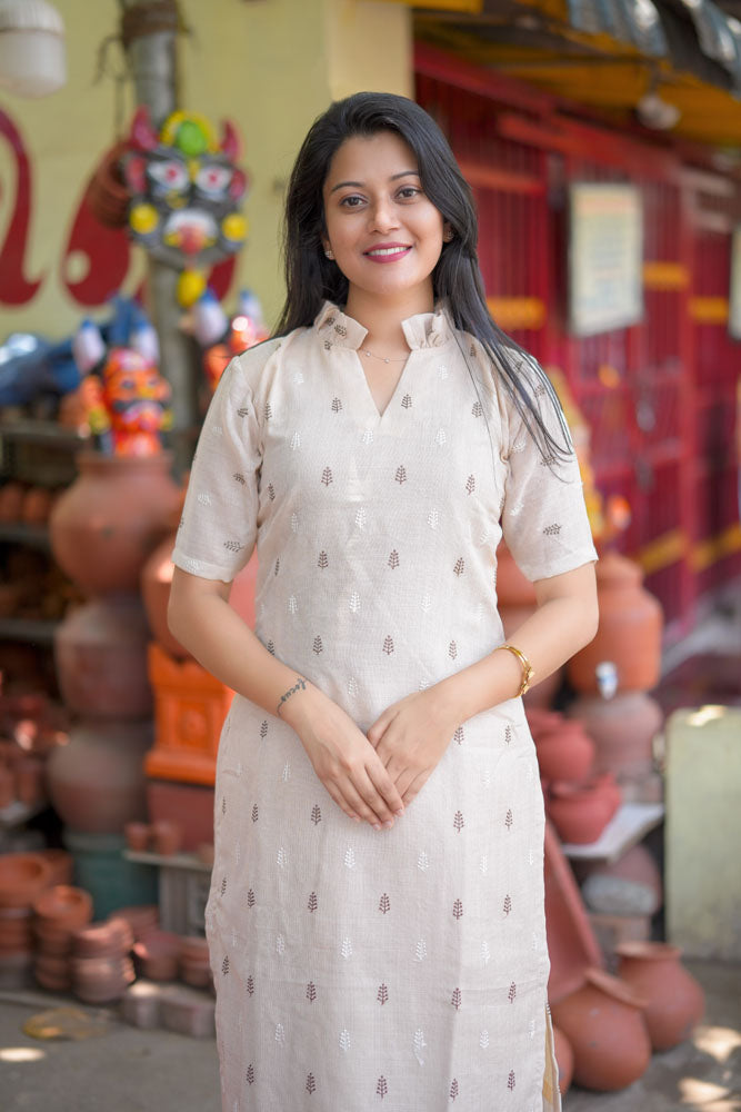 Upgrade your everyday wardrobe with this light chocolate printed cotton coord set. Designed with a chic mandarin collar with V-notch neckline, elbow-length sleeves, and a straight-fit silhouette, the kurta features delicate all-over motifs that add charm to the look. The set comes with matching straight pants, making it a versatile outfit for office wear, casual gatherings, or day outings. Crafted from breathable cotton fabric, this coord set ensures both comfort and elegance. Pair it with flats or minimal sandals for a graceful finish.