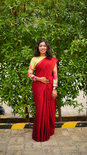 Step into timeless elegance with this stunning cherry-red saree paired with a vibrant floral-print blouse. The saree drapes gracefully, giving a refined ethnic look suitable for festive functions, office celebrations, and traditional events. The floral full-sleeve blouse adds a fresh and modern touch, making the entire outfit classy yet lively.