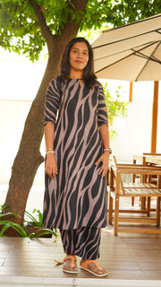 Discover this elegant zebra print kurta set for women, perfect for casual and semi-formal occasions. Made from soft, breathable fabric, this outfit combines modern style with traditional comfort. Pair it with minimal accessories for a chic everyday look.